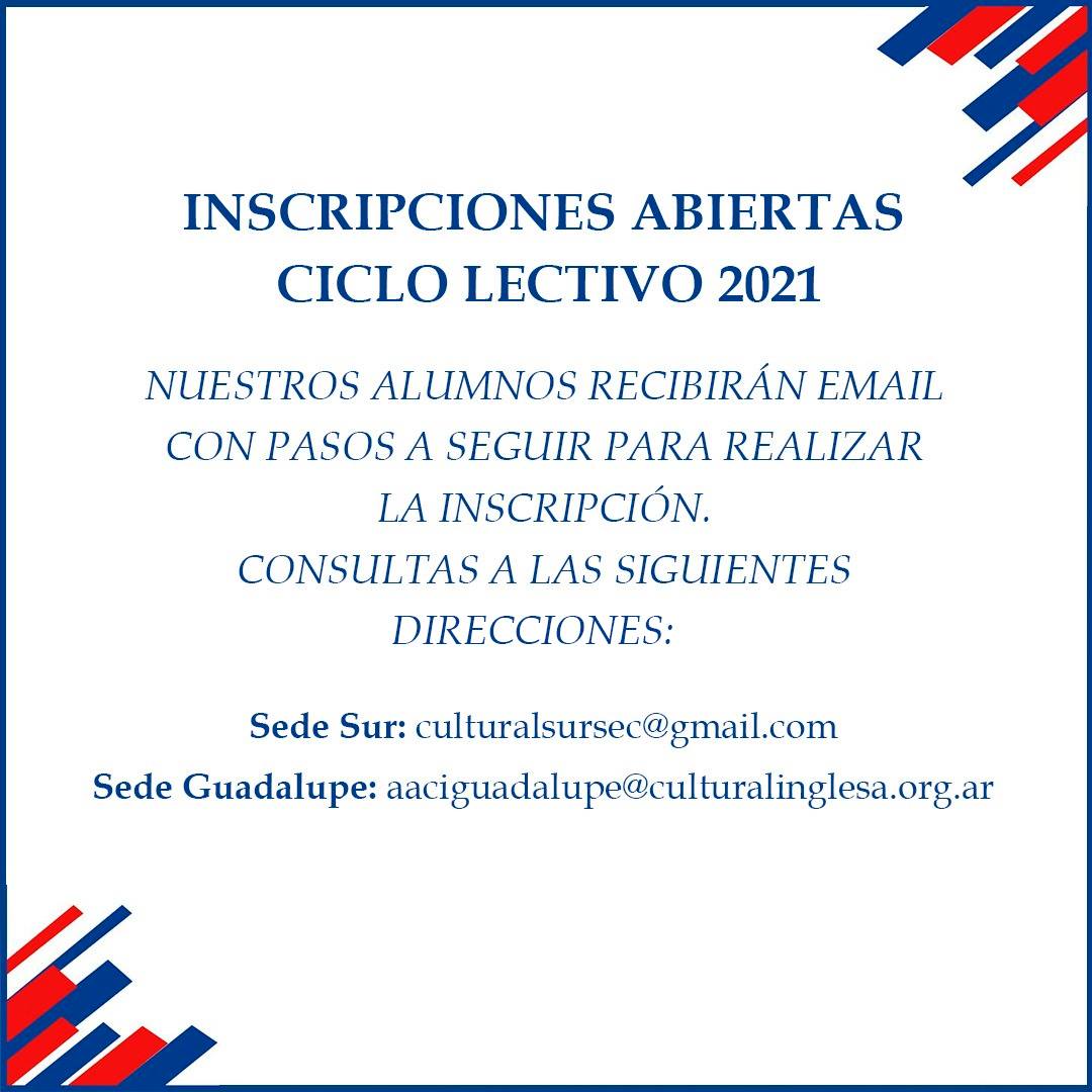 Consultas en las siguientes direcciones: SEDE SUR: culturalsursec@gmail.com SEDE GUADALUPE: aaciguadalupe@culturalinglesa.org.ar